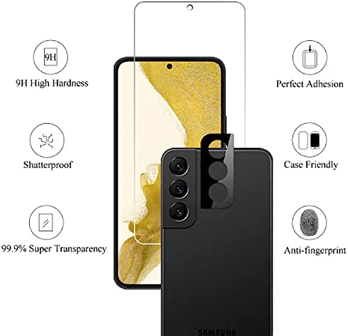 It is 100% brand new, High Definition, preserve the way of stunning HD Display, but also with maximum protection! Protect the Screen against dust, scratches and shocks by coating the glass shield on the screen. Precise laser cut tempered glass, exquisitely polished, rounded edges. Original HD Clarity and Touchscreen Accuracy. Reduces fingerprints- Oleophobic Coating magically resists oils and reduces annoying fingerprints. Perfect fit: the Screen Protector is specially designed for Samsung Galaxy S22+/S22 Plus 5G. Protect the Screen against dust,scratches and shocks by coating the glass shield on the screen. Easiest Installation - removing dust and aligning it properly before actual installation,no worries about bubbles,enjoy your screen as if it wasn't there.Precise laser cut tempered glass,perfect fits.