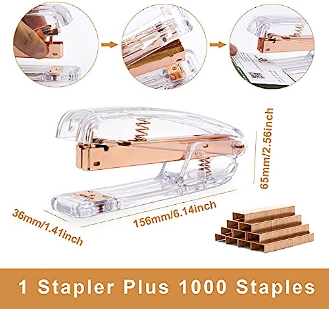 【Specification】 the gold stapler size:6.14 x 1.41x 2.56 inch; Tape dispenser size:4.88 x 1.41 x 2.64 inch; Staple Remover size is 2.36x 0.61x 1.57inch; Binder Clips szie is 0.75x 0.35inch; Pencil Holder size is 3.15x 3.86inch, all rose gold rose gold tape dispenser and stapler are regular size for office desk use.