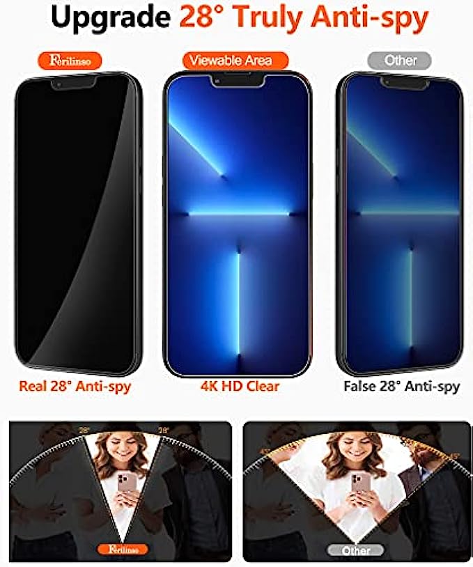 • True 28° Privacy Protection: Ferilinso Privacy Coatings made of new materials from germany, have better Privacy performance than other materials. the screen is only visible to persons directly in front of the iPhone 13 Pro Max 6.7 inch screen and does not affect power. Keeps your personal, private, and sensitive information hidden from strangers, Provides the most powerful protection, even your friends or colleagues sitting next to you also can't see on your messages.