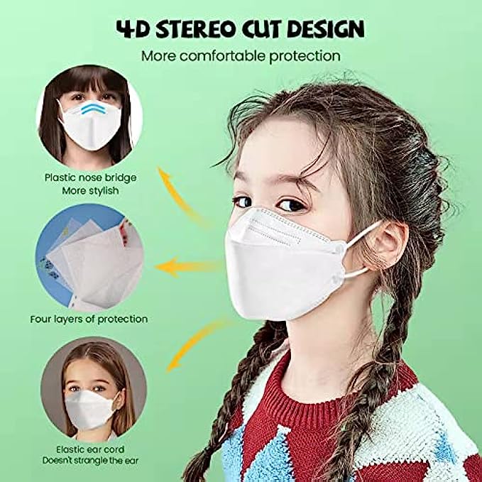 QUADRUPLE FILTRATION SYSTEM: These kids' KF94_mask features 4 layers of premium filters and, a skin-friendly inner layer to protect the respiratory system. The inner layer of our face mask is constructed using spun-bond fabric that remains soft and your kid's sensitive skin while blocking fine dust, nanoparticles, and other elements. COMFORTABLE ERGONOMIC DESIGN: lightweight breathable KF94_face mask is designed with your kids' comfort in mind. The mask U-shaped triangle solid is intended to align with the nose, chin, and ear for a comfortable fit and efficiently blocks the inhaling of the fine dust through the adhesion structure. LIGHTWEIGHT AND BREATHABLE: Presents you with a nanofiber insert kids' KF94_face mask that creates a protective layer and keeps the weight light. This premium reusable face mask will protect your kid's from inhaling harmful substances when allowing them to breathe fresh and pure air. DURABLE AND ELASTIC EAR LOOP: The cute kids' KF94_mask features a skin-friendly elastic ear band made using soft and durable material that ensures comfort. This elastic ear hook is made of a latex-free mask to reduce the pressure on your small ears, assuring prolonged wear throughout the day. EASY TO USE DISPOSABLE FACE_MASK: After wearing this face mask, press the nose pin for a comfortable and protective fit. These kids' face masks are suitable for boys and girls at home, school, parks, outdoors, and busy public places.