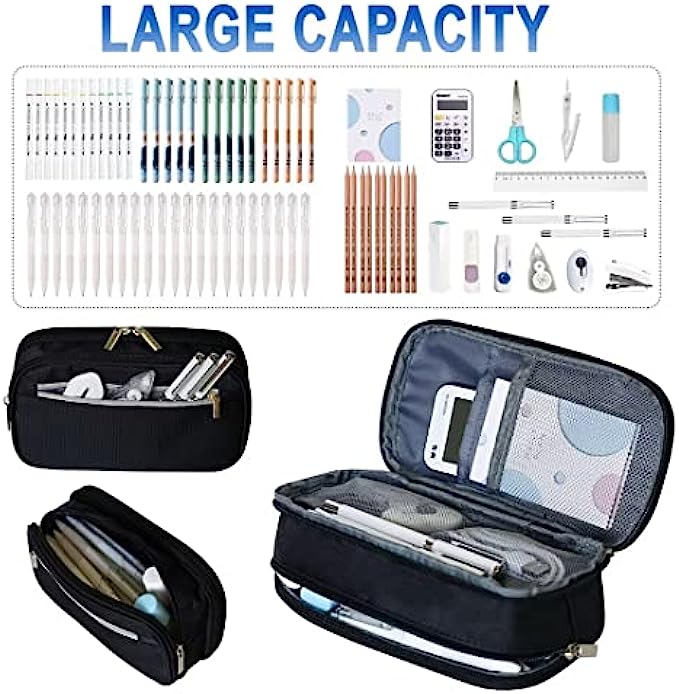 Large Capacity: Dimensions is 8.74*5.11*1.18 inches. The main compartment fit up to 50-70 pens/pencils, and can store small stationery in the side pockets, such as notes, sticker, etc. The other compartment, can put a few shorter pens that are often used, even scissors, rubber, tape can be easily stored, and can hold a calculator and rulers, staplers. This compartment design not only protect stationery and accessories in a better way, but also keeps things neatly organized and accessible.
