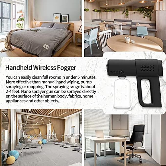 【Handheld Wireless Fogger】You can easily clean full rooms in under 5 minutes. More effective than manual hand wiping, pump spraying or mopping. The spraying range is about 2-4 feet. Nano sprayer gun can be sprayed directly on the surface of the human body, fabrics, home appliances and other objects.