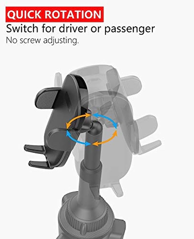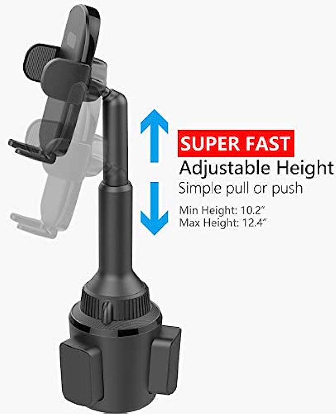 Quick Extension Sturdy Arm: No more screws adjusting, just pull and push to adjust the height. Easy one-hand operation! The car cup holder phone mount can reach a maximum height of 12.4" for easy operating and access to your device without blocking anything on the console. No Blind Sides: Thanks to a rotatable neck, swivel your device quickly and simply at any time to your optimal viewing angle, no more reinstalling the cup phone holder to rotate it to a sweet spot. Tilt, rotate, or swivel easily to adjust your device with the phone holder either in landscape or vertical viewing angle. Solid Adjustable Cup Holder: The adjustable mounting base has 3 rubber padded claws that fit securely into a car cup holder between 3.02" and 4.62" in diameter, no wobbling even on a bumpy road, enjoy hands-free driving, and spend more times at the wheel. Tool-free installation, simply adjust the screw to expand the base to fid your cup holder. One-Hand Operation Versatile Phone Car Mount: One press release design, install or remove a smartphone with only one hand. The cup phone holder for car has a foot and two adjustable arms with a silicon pad, it holds the cell phone tightly. The open bottom tray design provides access to effortless charging. Super Compatibility Cup Phone Holder for Car: Adjustable extension arm design is suitable for all iPhone & Andriod Cell Phones although with a thick case, iPhone cup holder for car compatible with iPhone 13 Pro Max, 13 Pro, 13 Mini, 13, 12 Pro Max, 12 Pro, 12 Mini, 12, 11 Pro Max, 11 Pro, 11, XS Max, XS, XR, X, 8 Plus, 8, 7 Plus, 7, SE (2022), SE (2020), SE, 6s Plus, 6s, 6 Plus, 6, 5s 5c 5 4S 4; cup phone holder for Google Pixel 6Pro 6 5a 5 4a 4XL 4 3aXL 3a 3XL 3 2XL 2 1, Nexus 6P 6 5X 5, etc Universal Cupholder Phone Holder for Car: works for Samsung Galaxy S22Ultra S22+ S22 S21+ S21Ultra S21 S20FE S20 S20Ultra S20+ S10 S10+ S10e S9 S9+ S8 S8+ S7 S6 S5 S4 S3 S2 S, Note 20Ultra 20 10 10+ 9 8 5 4 3 2 1, A91 A90 A80 A72 A71 A70 A70s A60 A53 A52S A52 A51 A50 A50s A42 A41 A40 A40s A33 A32 A31 A30 A30s A23 A22s A22 A21 A20 A13 A12 A11 A10 A10e A10s A03 A02 A01, M62 M53 M52 M51 M42 M42 M40 M33 M32 M32 M31 M30 M23 M22 M21 M20 M12 M11 M10 M02 M01, F62 F52 F42 F41 F23 F22 F12 F02S and more.