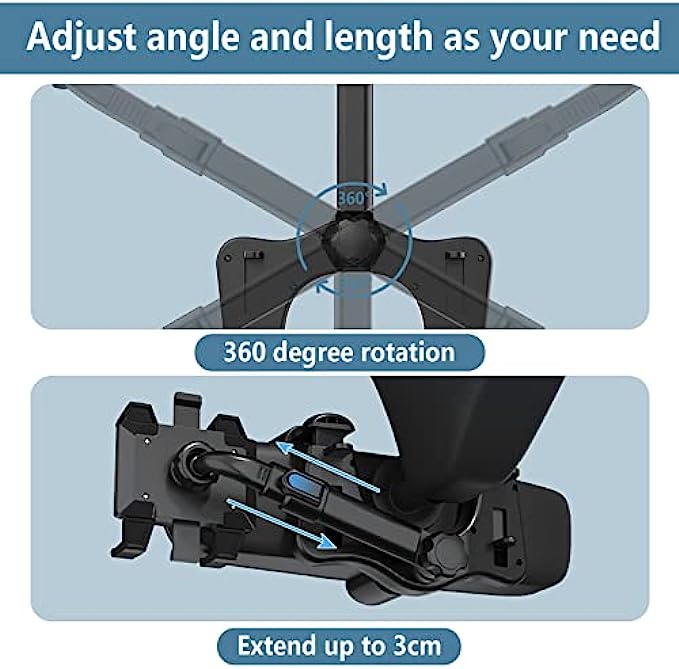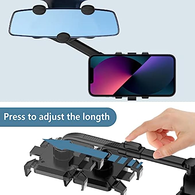 - 360-Please note: 1. The thickness of the rearview mirror is 3-6cm, and the height is 6-9cm; 2. If your rearview mirror is very close to the front windshield, it is not recommended that you buy it, otherwise it cannot be used in your car. degree rotation adjustment, you can always find the angle that suits you. - Thickened silicone pad, Vientiane roller, exquisite workmanship, light and durable. - Retractable and adjustable rods, which can be long or short, can be adjusted as needed, and can be retracted and hidden behind the rearview mirror, without affecting the vision of driving. - Driving navigation, live broadcast, video shooting, watch TV show, you can try it in any occasion where you need it.