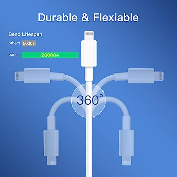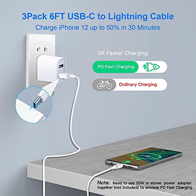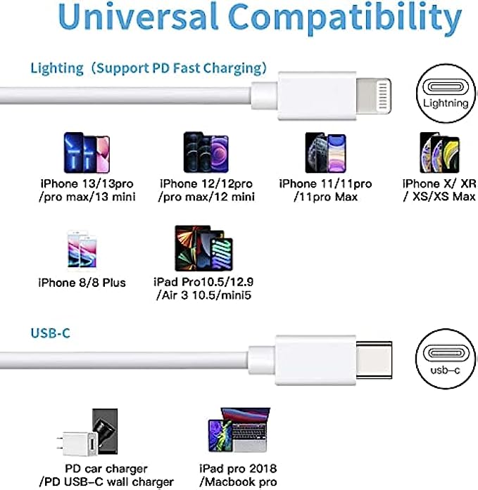 【Power Delivery Fast Charging & SYNC】:Mitesbony USB-C to lightning cable supports high-speed power delivery fast Charging, can charge the iPhone 12 up to 50% in 30mins. The type c to lightning cables also support data transfer rate up to 480Mbps,which can easily transfers music, photos and files between iPhone and laptop or desktop computer in seconds.(Note:You need to use 20W or above USB-C Power Adapter to achieve Power Delivery Fast Charging.) 【Apple Mfi Certified】:Mitesbony type-c to lightning cable has completed MFi certification requirements.Each usbc to lightning cable uses New C94 connector designed for fast charging and MFI certified chip ensure your devices charge safely, at their fastest possible speed, and no longer triggers warning messages. 【Unparalleled Quality】:These super durability and flexibility and no tangles iphone usb c cables are made of top-rated material and coated with premium TPE.Built-in overvoltage protection to ensure charging safety, which last 4X longer than other iphone charger cords and proven to withstand over 20,000 bends in strict laboratory tests. 【Compatibility List】: Mitesbony USB C lightning cable supports PD Fast Charge for iPhone 13/13ProMax/13Pro/13Mini/12/12ProMax/12Pro/12Mini/11/11Pro/11ProMax/XS Max/XS/XR/X/8 Plus/8 and iPad 8th/iPad 2020/iPad Pro 12.9" gen1/iPad Pro 12.9" gen2/iPad Pro 10.5"/iPad Air3 10.5"/iPad mini5 7.9".The usb c iphone charger also supports standard charge for iPhone 7 Plus/7/6 Plus/6/6S Plus/6S /5 etc. 【What You Get】:3pack 6ft USB-C to lightning cables. We give them a hassle-free, lifetime warranty,If you have any questions, please feel free to contact us, we will resolve your issue within 24 hours.