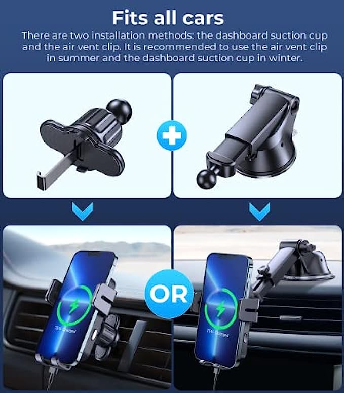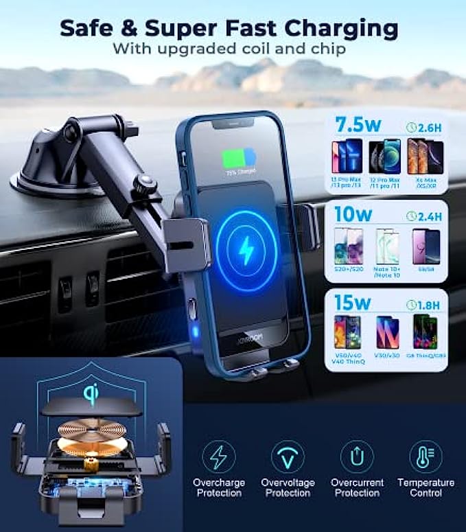 ? 【Qi Wireless Car Fast Charger】 Qi certificated, the 15W wireless car charger mount is for LG V50/V40/V30+/V30/V40, ThinQ G8/G8S/G7; 10W for Samsung Galaxy S20+/S20/Note 10+/Note 10/S10+/S10; 7.5W for iPhone 13 pro max/13 pro/13/12 Pro/12/11/11 Pro/11 Pro Max /SE /XS /X/XR/8 Plus/8. And other Qi-enabled cell phones with up to 5W standard charging. Note: iPhone 12 Mini is not supported. ? 【Auto-Sensing & Smart Charging】 After connecting to the cable, Joyroom car phone holder mount wireless charging will automatically clamp when your phone is dropped in. A gentle touch on the 2 sides button of the car charger can make the arms open, which makes your driving easier and safer. When your phone is fully charged, the wireless charging car mount will automatically power off to protect the battery of your phone. ? 【Super Stable Base】Joyroom phone mount for car wireless charger's base is equipped with a powerful suction cup and professional 3M adhesive (high temperature resistant). The base's suction cup has been tested thousands of times, it can absorb more than 20 pounds of objects without dropping. Even if passing speed bumps or driving on mountain roads, you don’t need to worry about it falling. In addition, the bracket arm and clip are equipped with silicone pads for anti-slip and anti-vibration. ? 【Flexible Angle & Case Friendly】 With a retractable & foldable bracket and 360° rotatable head, it never blocks your driving sight, you can adjust it to a position that makes you comfortable. Joyroom car mounts wireless charger supports charging through phone cases up to 5mm thick. Please note that cases made of metal, external attachments such as magnets, credit cards, grips, and stands will interfere with charging. ? 【2 In 1 Design】Combines the wireless phone charger & car phone mount allowing for a secure hands-free experience. Keep you away from the tangled locating cords or cables. Joyroom car phone holder mounts charger is suitable for Windshield, Dashboard, and Air Vent installation, and makes GPS and phone calls more convenient.