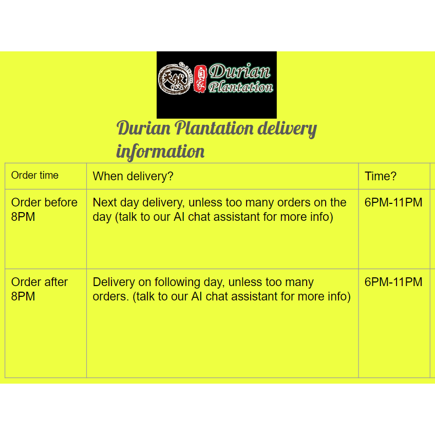 Durian was delivered pretty fast. Delivery called prior to sending. Quality of the 3 types of durian was very good. Currently it's durian season, so better to order now
