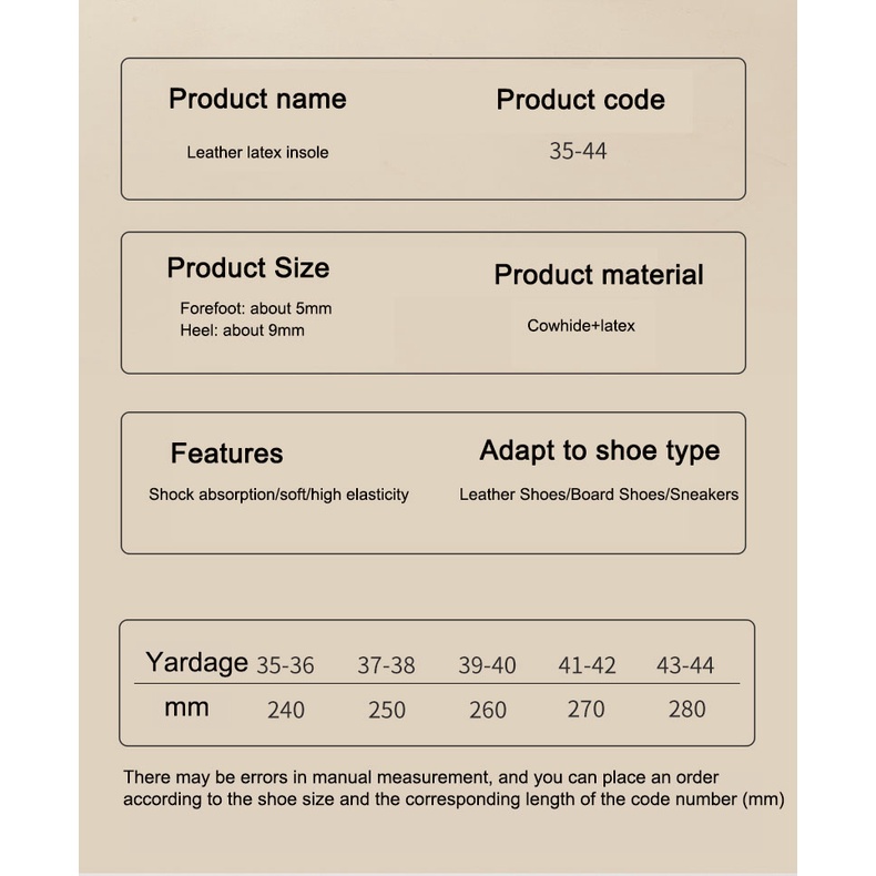 Colour:Beige Material Quality:leather latex Well received. Bought it to replace memory foam padding for my jelly shoe. This is even better. Thick material. Comfortable when walking. Good buy. Also suitable for loose shoes.?